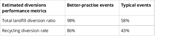 By implementing and following these steps, events can aim to improve their performance metrics dramatically. The following estimated performance metrics, comparing a better-practice event with a typical event, are based on an analysis of a dataset of a sample of events held within Australia.